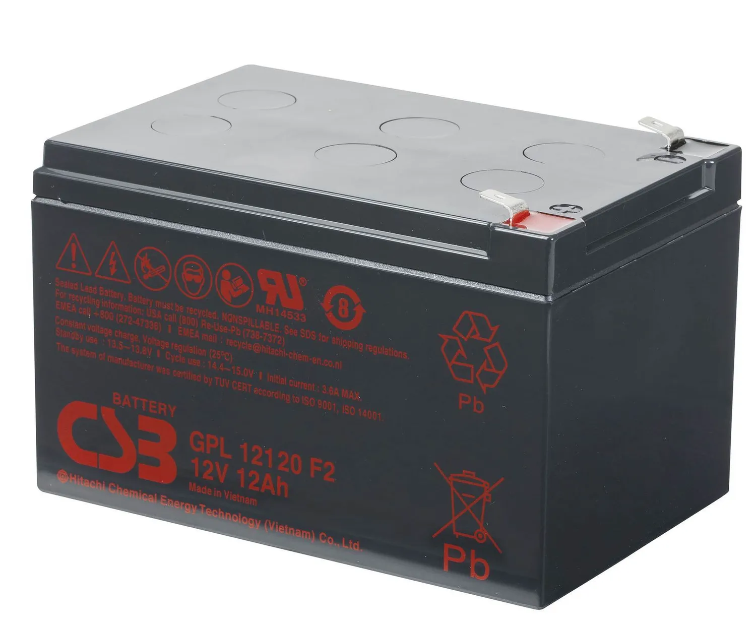 Аккумулятор CSB GPL 12120 - батарея общего применения со сроком службы 8 лет в буферном режиме (6-9 лет при 20°С по классификации Eurobat) или более 260 циклов заряда-разряда в циклическом режиме при 100% разряде.