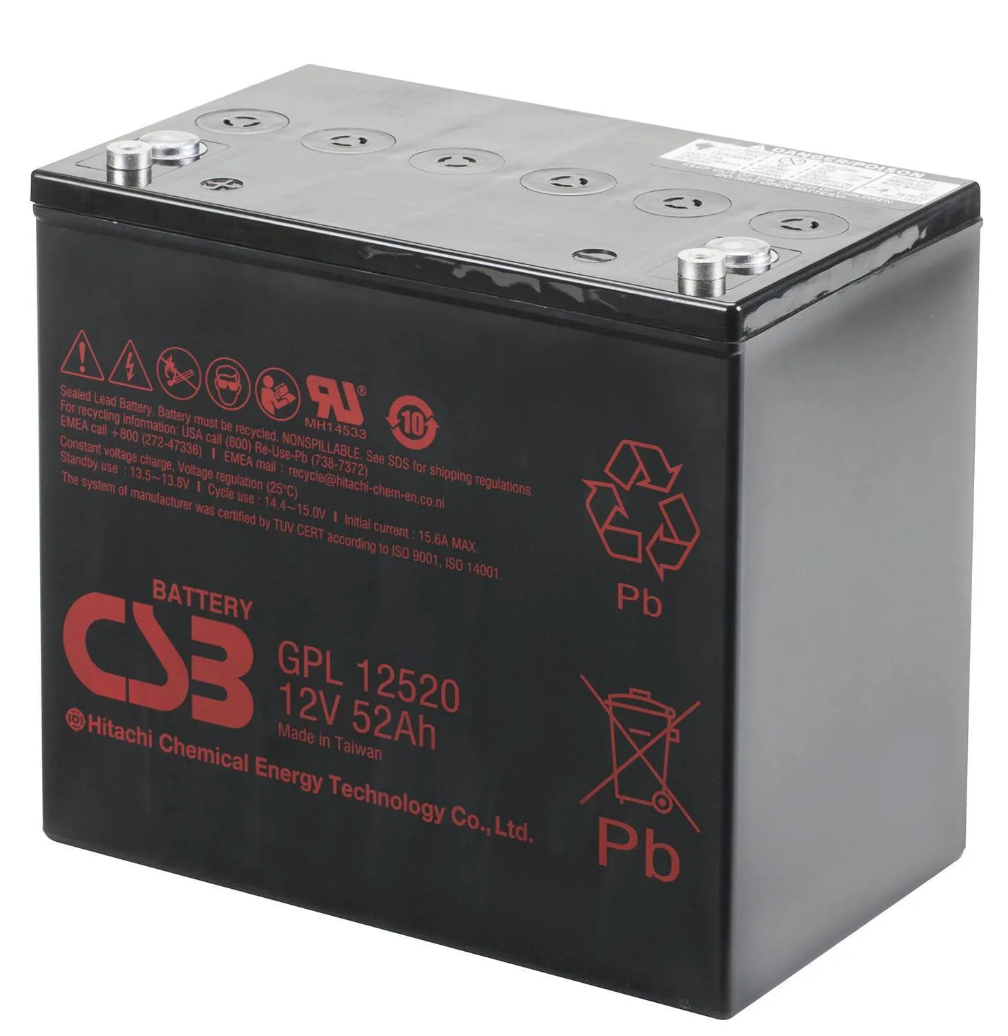 Аккумулятор CSB GPL 12520 - батарея общего применения со сроком службы 10 лет в буферном режиме (10-12 лет при 20°С по классификации Eurobat) или более 260 циклов заряда-разряда в циклическом режиме при 100% разряде.