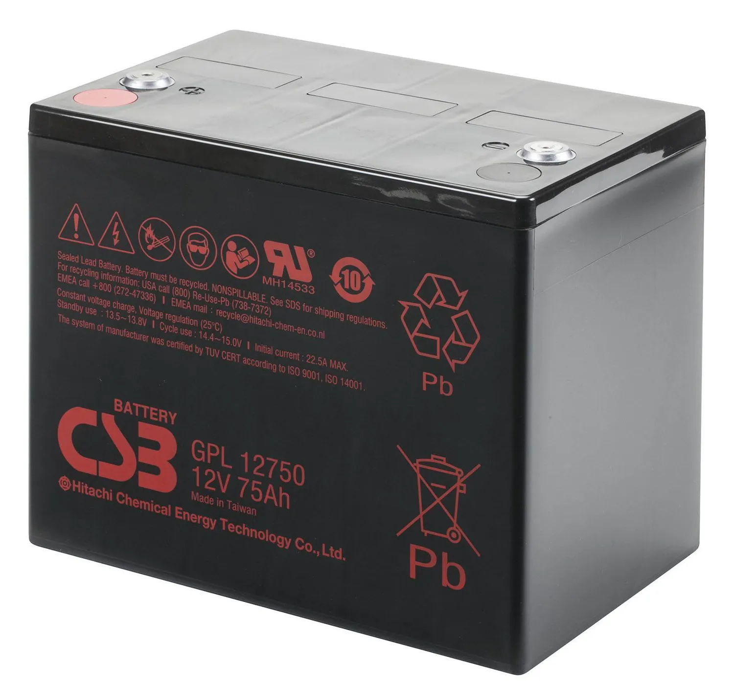 Аккумулятор CSB GPL 12750 - батарея общего применения со сроком службы 10 лет в буферном режиме (10-12 лет при 20°С по классификации Eurobat) или более 260 циклов заряда-разряда в циклическом режиме при 100% разряде.
