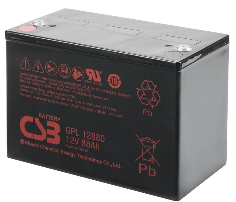GPL 12880 - батарея общего применения со сроком службы 10 лет (10-12 лет при 20°С по классификации Eurobat) в буферном режиме или более 260 циклов заряда-разряда в циклическом режиме при 100% разряде. Как и все батареи CSB, она перезаряжаемая, высокоэффективная и не требующая обслуживания.