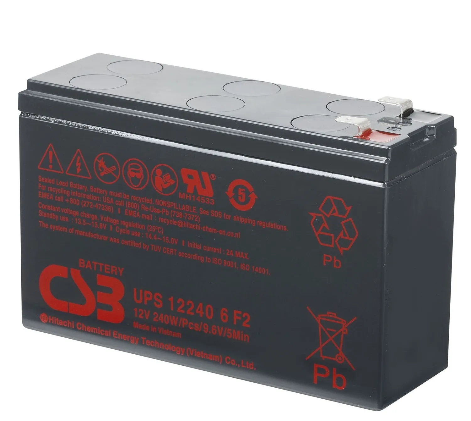 Аккумулятор CSB UPS122406 - специально разработанная батарея для эксплуатации в режиме высоких токов при коротком времени разряда. Ее особенности - высокая энергоемкость и небольшие габаритные размеры. Срок службы: до 5 лет в буферном режиме или более 260 циклов зарядаразряда в циклическом режиме при 100%разряде