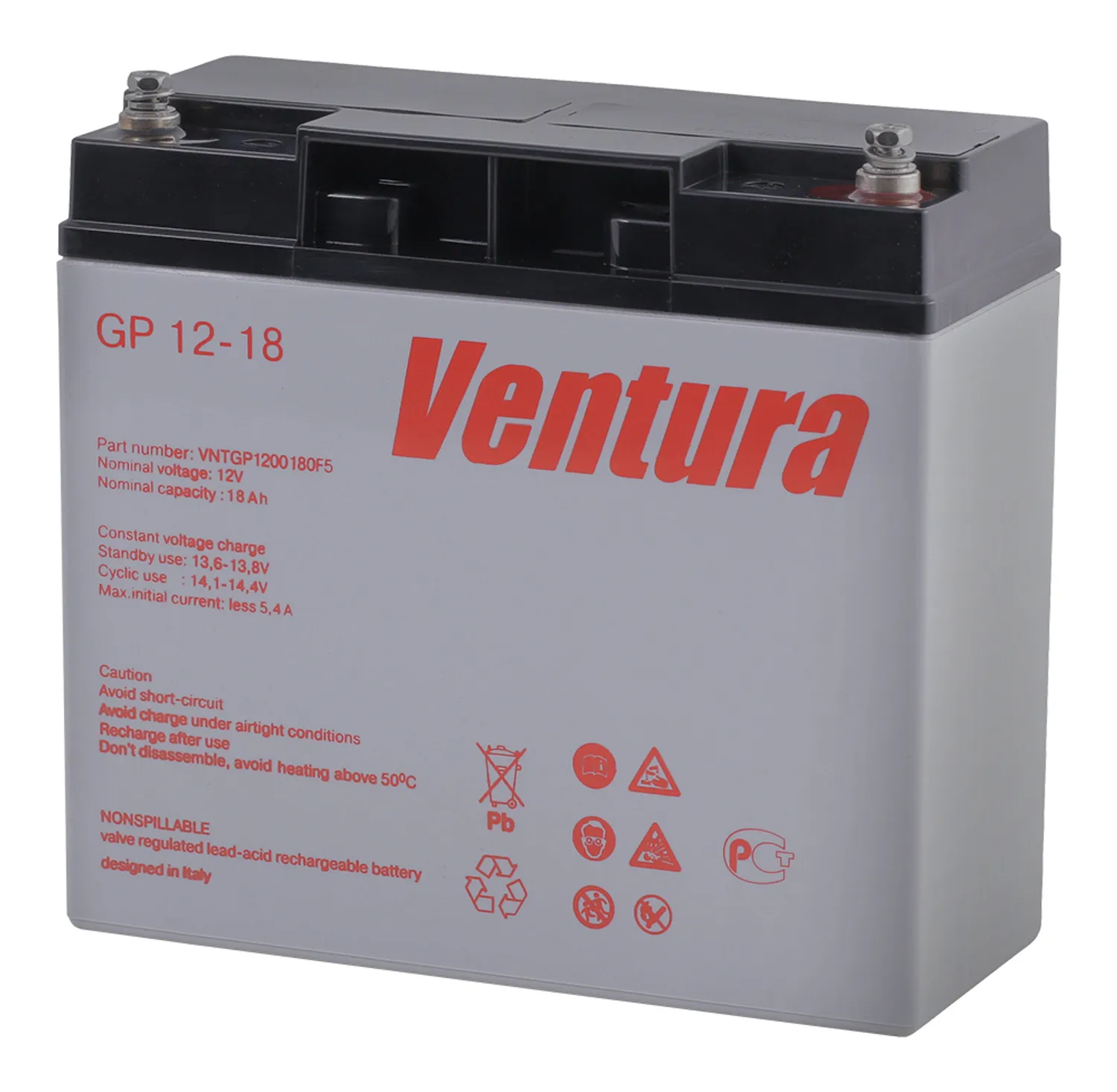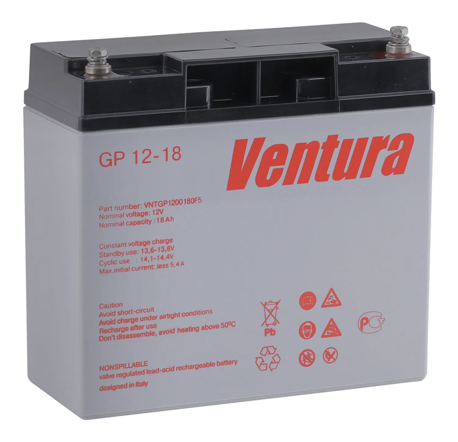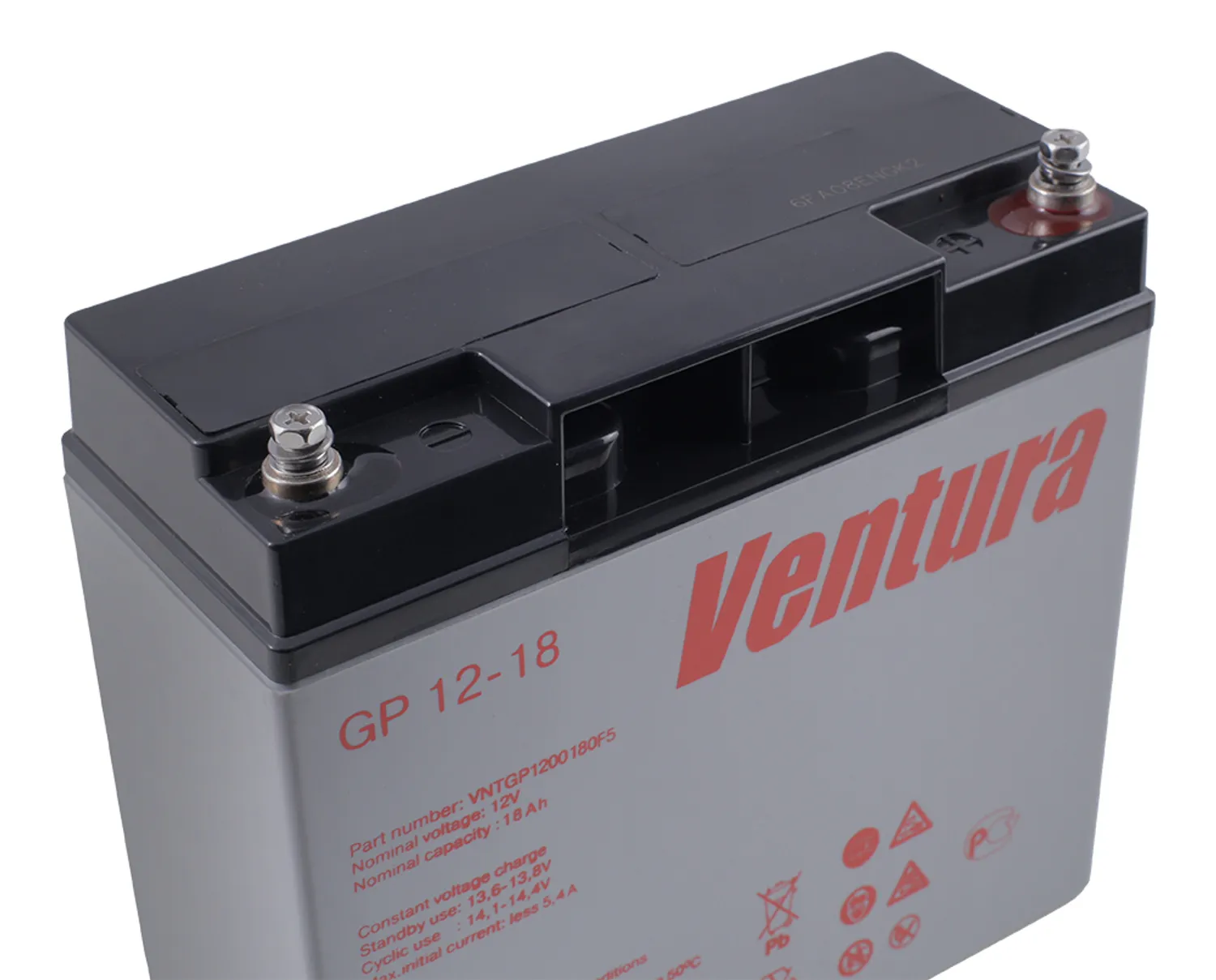Герметизированные необслуживаемые свинцово-кислотные аккумуляторы Ventura серии GP изготовлены по технологии AGM (Absorbent Glass Mat- электролит, впитанный в стекловолоконный сепаратор). Благодаря высокой степени рекомбинации (более 99%), не требуется долива дистиллированной воды, измерения температуры и плотности электролита в течение всего срока службы. Предназначены для эксплуатации, как в режиме постоянного подзаряда, так и в циклическом режиме. Возможен монтаж в горизонтальном и вертикальном положении. Установка на крышку, клеммами вниз, не допускается. Аккумуляторы разрешены к перевозке любым видом транспорта, включая авиационный.