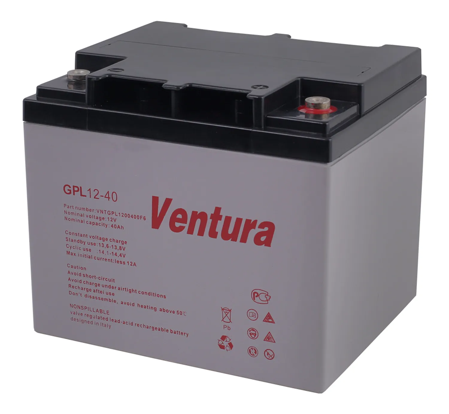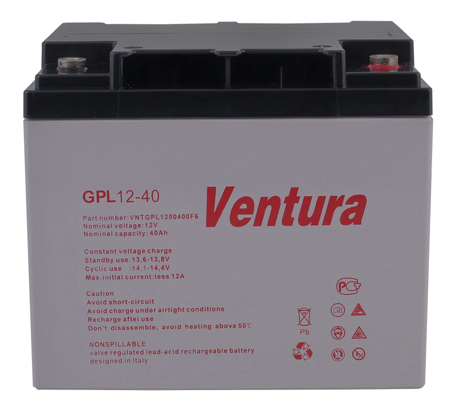 Герметизированные необслуживаемые свинцово-кислотные аккумуляторы Ventura серии GPL изготовлены по технологии AGM (Absorbent Glass Mat - электролит, впитанный в стекловолоконный сепаратор). Благодаря высокой степени рекомбинации (более 99%) не требуется долива дистиллированной воды, измерения температуры и плотности электролита в течение всего срока службы. Предназначены для эксплуатации, как в режиме постоянного подзаряда, так и в циклическом режиме. Возможен монтаж в горизонтальном и вертикальном положении. Установка на крышку (клеммами вниз) не допускается. Аккумуляторы разрешены к перевозке любым видом транспорта, включая авиационный.