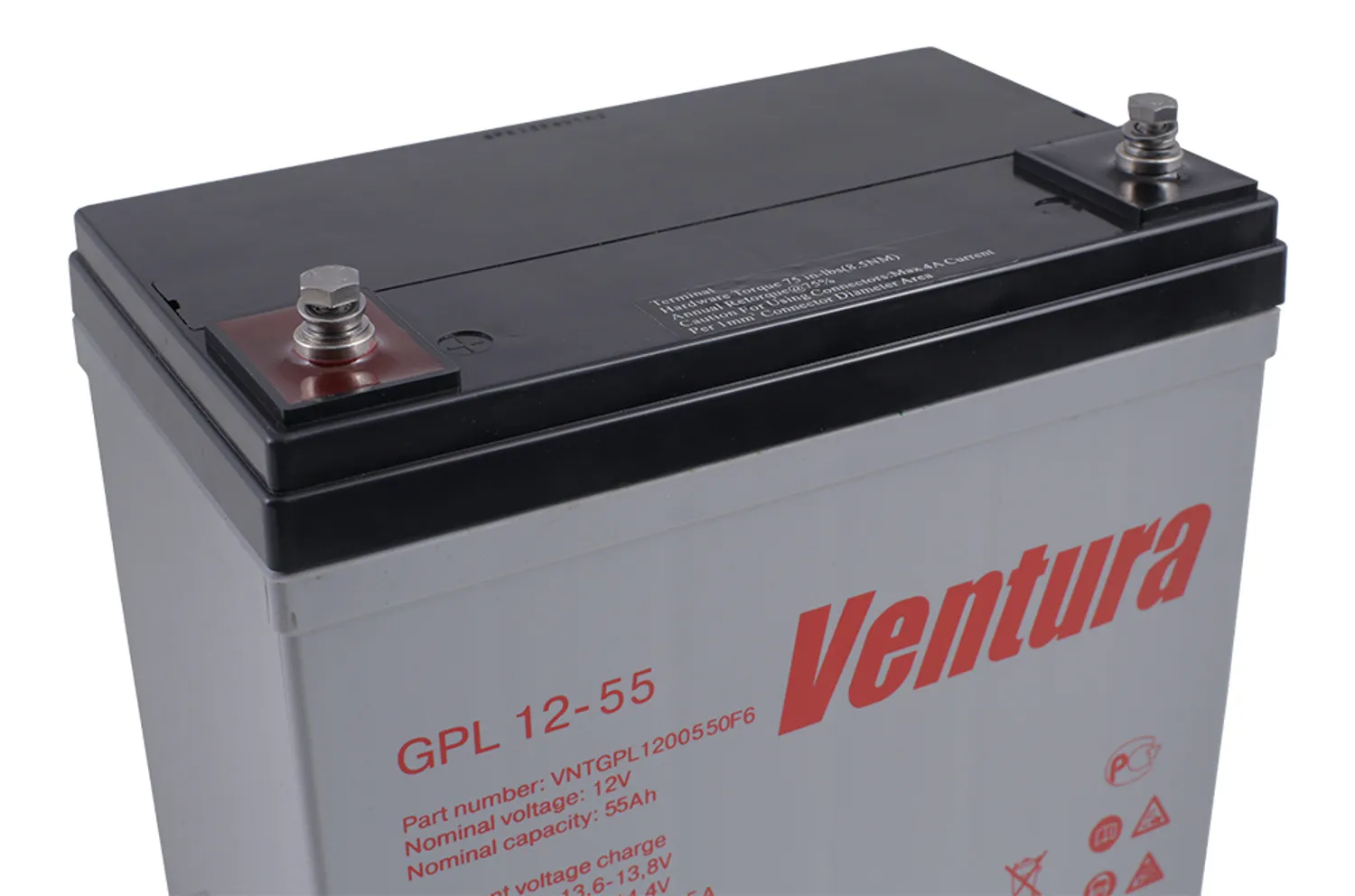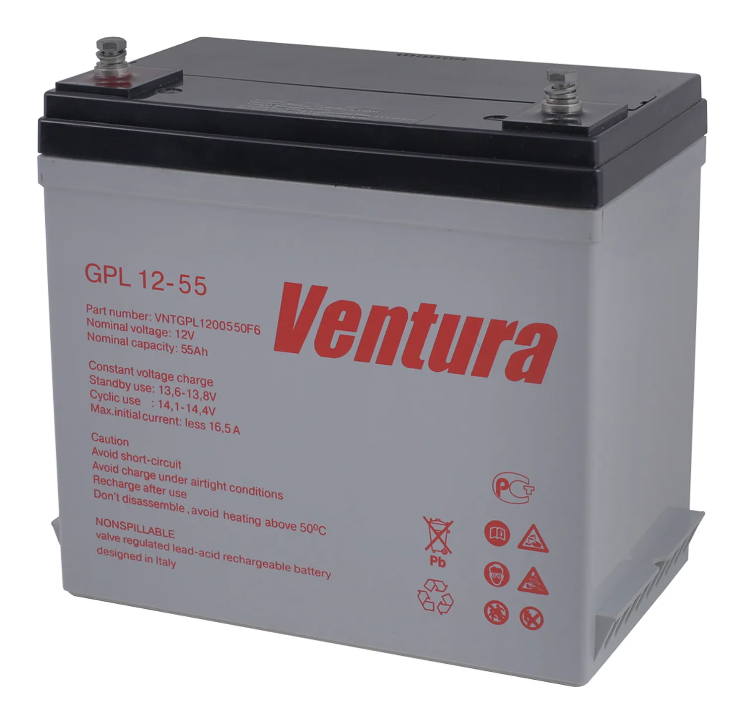 Герметизированные необслуживаемые свинцово-кислотные аккумуляторы Ventura серии GPL изготовлены по технологии AGM (Absorbent Glass Mat - электролит, впитанный в стекловолоконный сепаратор). Благодаря высокой степени рекомбинации (более 99%) не требуется долива дистиллированной воды, измерения температуры и плотности электролита в течение всего срока службы. Предназначены для эксплуатации, как в режиме постоянного подзаряда, так и в циклическом режиме. Возможен монтаж в горизонтальном и вертикальном положении. Установка на крышку (клеммами вниз) не допускается. Аккумуляторы разрешены к перевозке любым видом транспорта, включая авиационный.