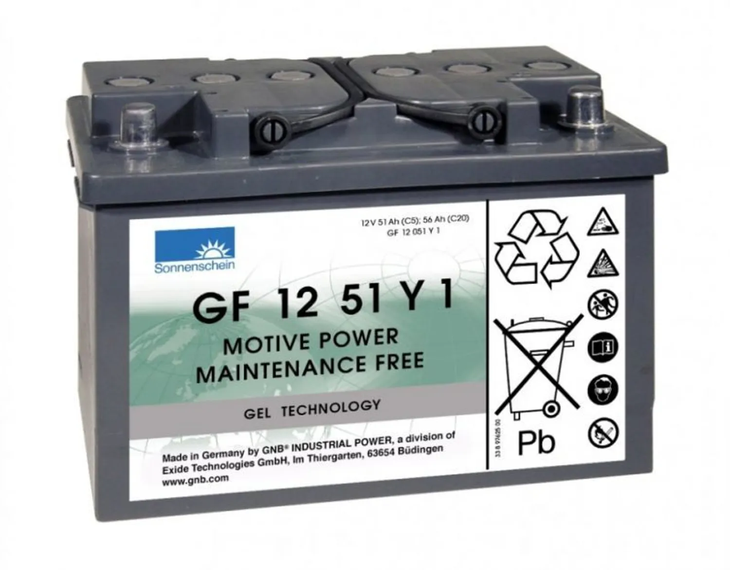 Sonnenschein GF 12 051 Y 1 полностью необслуживаемые тяговые аккумуляторы с намазными пластинами. Данные аккумуляторы являются герметизированными и полностью необслуживаемыми, электролит находится в желеобразном состоянии. Полностью необслуживаемые герметизированные блочные тяговые аккумуляторы идеально подходят для использования на небольших устройствах на электротяге, таких как лодочные моторы, инвалидные коляски, скутеры и т.п.