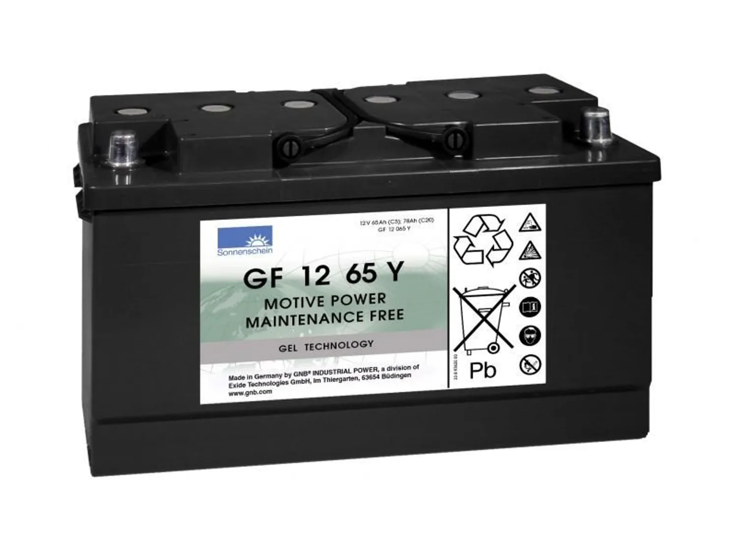 Sonnenschein GF 12 065 Y полностью необслуживаемые тяговые аккумуляторы с намазными пластинами. Данные аккумуляторы являются герметизированными и полностью необслуживаемыми, электролит находится в желеобразном состоянии. Полностью необслуживаемые герметизированные блочные тяговые аккумуляторы идеально подходят для использования на небольших устройствах на электротяге, таких как лодочные моторы, инвалидные коляски, скутеры и т.п.
