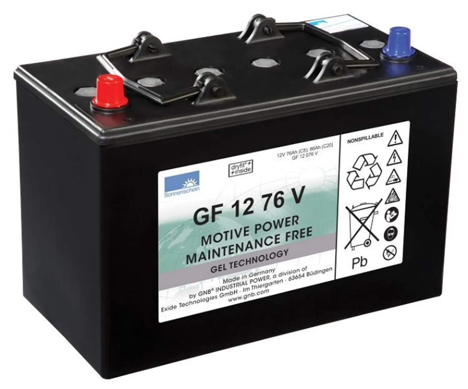 Sonnenschein GF 12 076 V полностью необслуживаемые тяговые аккумуляторы с намазными пластинами. Данные аккумуляторы являются герметизированными и полностью необслуживаемыми, электролит находится в желеобразном состоянии. Полностью необслуживаемые герметизированные блочные тяговые аккумуляторы идеально подходят для использования на небольших устройствах на электротяге, таких как уборочные машины, электроштабелеры малой мощности, подъемные платформы и т.д.