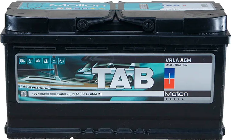 Аккумулятор TAB Motion AGM - VRLA клапанно-регулируемый свинцово-кислотный аккумулятор, использующий технологию AGM (Absorbent Glass Mat – поглощающее стекловолокно). Положительные пластины изготовлены из сплава PbCaSn, а отрицательные – из PbCa. Аккумулятор, не требующий обслуживания. Очень низкая скорость саморазряда, прочная конструкция, ударопрочная и виброустойчивая, высокие пусковые характеристики.