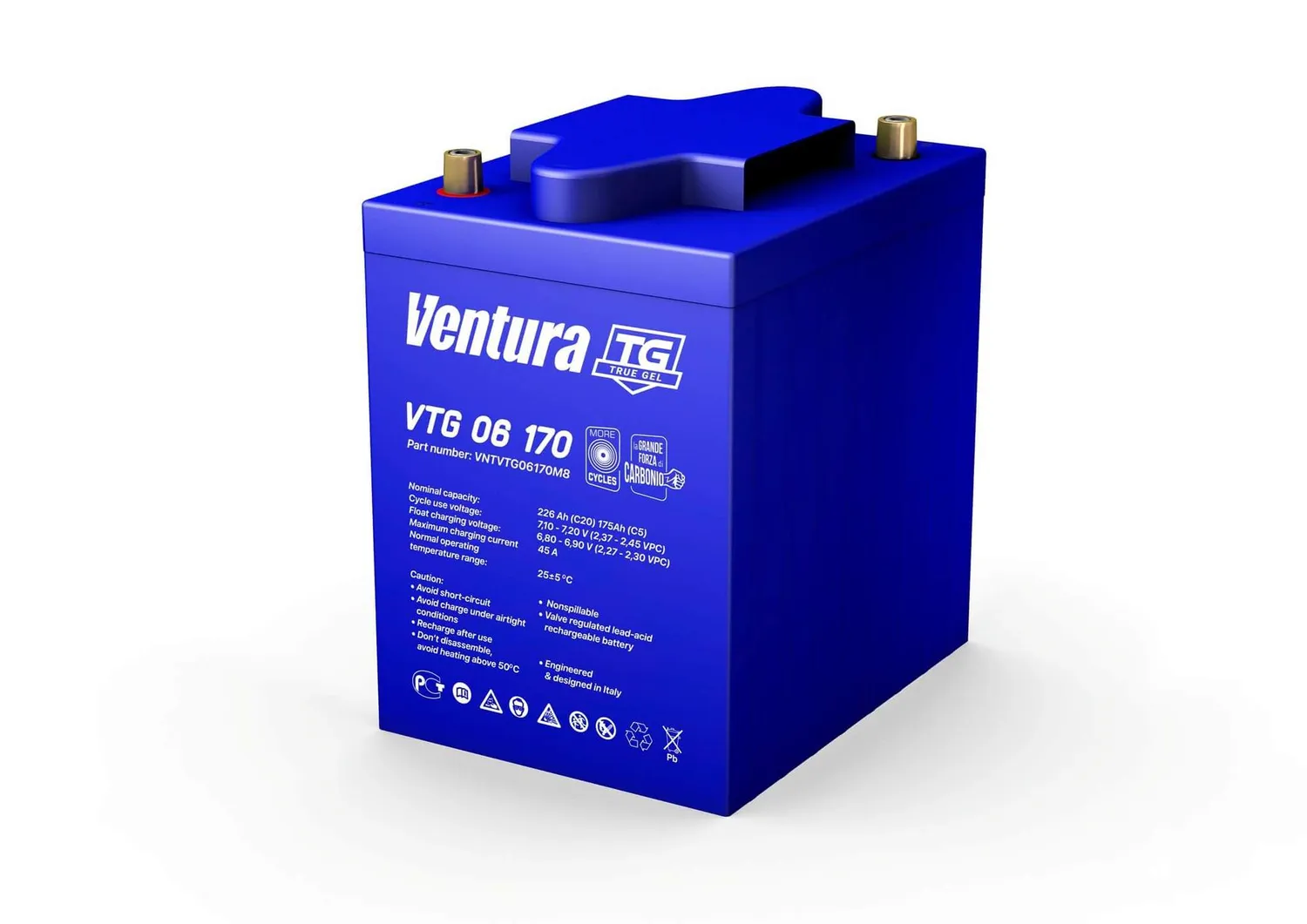 Тяговые аккумуляторы Ventura VTG 06 170 M8 - свинцово-кислотные герметизированные необслуживаемые моноблоки с намазными пластинами (тип VRLA) и гелеобразным электролитом. Являются отличным выбором во многих отраслях: электротранспорт, полоуборочная и подъемная техника, солнечные и ветряные системы, морские приложения, гольф-кары, электромобили, инвалидные электроколяски а также для ИБП, телеком и т. д.