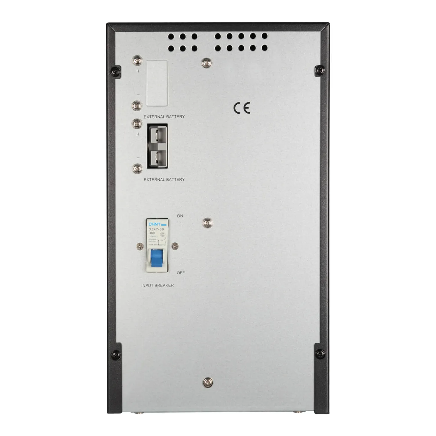 EA900Pro SBM 72-54 разработан специально для ИБП серии EAST EA900Pro-S мощностью 3 кВА. Подключение выполняется через разъёмы EXTERNAL BATTERY на задней панели модуля. Батарейный кабель входит в комплект поставки. На задней панели также расположен автоматический выключатель (INPUT BREAKER) для безопасного отключения батарейного модуля при обслуживании.