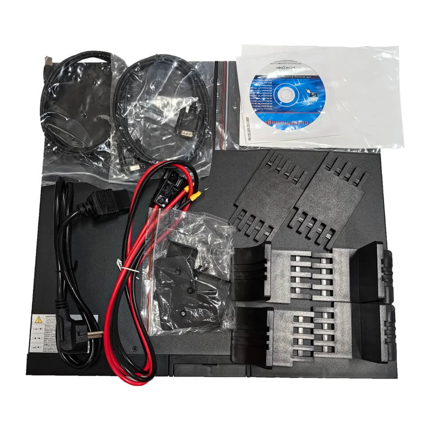 ИБП, силовые кабели для подключения нагрузки, кабель USB, рельсы для монтажа в стойку 19", документация. Аккумуляторы, SNMP-карта, плата сухих контактов и кнопка EPO заказываются отдельно.