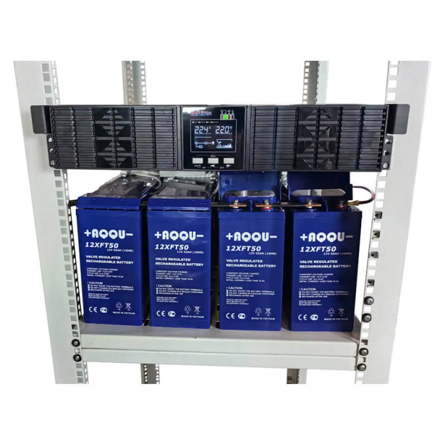 Индекс «LT» в названии модели — исполнение с увеличенным временем автономии: ИБП поставляется без встроенных АКБ и оснащён мощным зарядным устройством. На вход подключается линейка из 4 аккумуляторов 12 В последовательно (DC-шина 48 В), параллельное соединение линеек не предусмотрено.