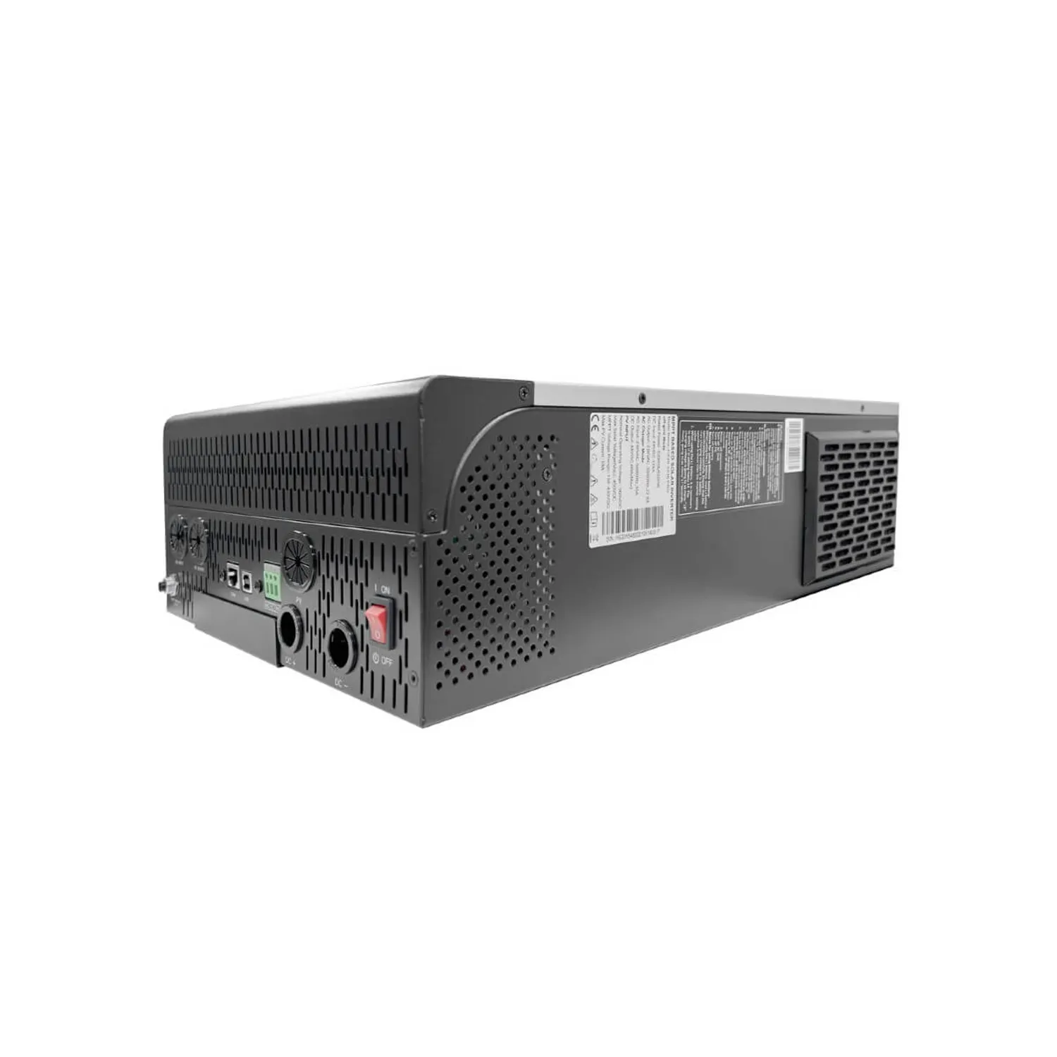 Встроенный MPPT-контроллер принимает солнечные панели общей мощностью до 5500 Вт при напряжении холостого хода до 450 В. Рабочий диапазон MPPT 150–430 В позволяет собирать длинные цепочки панелей без дополнительных контроллеров — до 10 модулей последовательно и до 7 параллельных линеек. Суммарный ток заряда от солнца и сети достигает 80 А. Три режима использования солнечной энергии: подмешивание на нагрузку для снижения потребления из сети, приоритетный заряд аккумуляторов или отдача излишков в сеть (grid-tie).