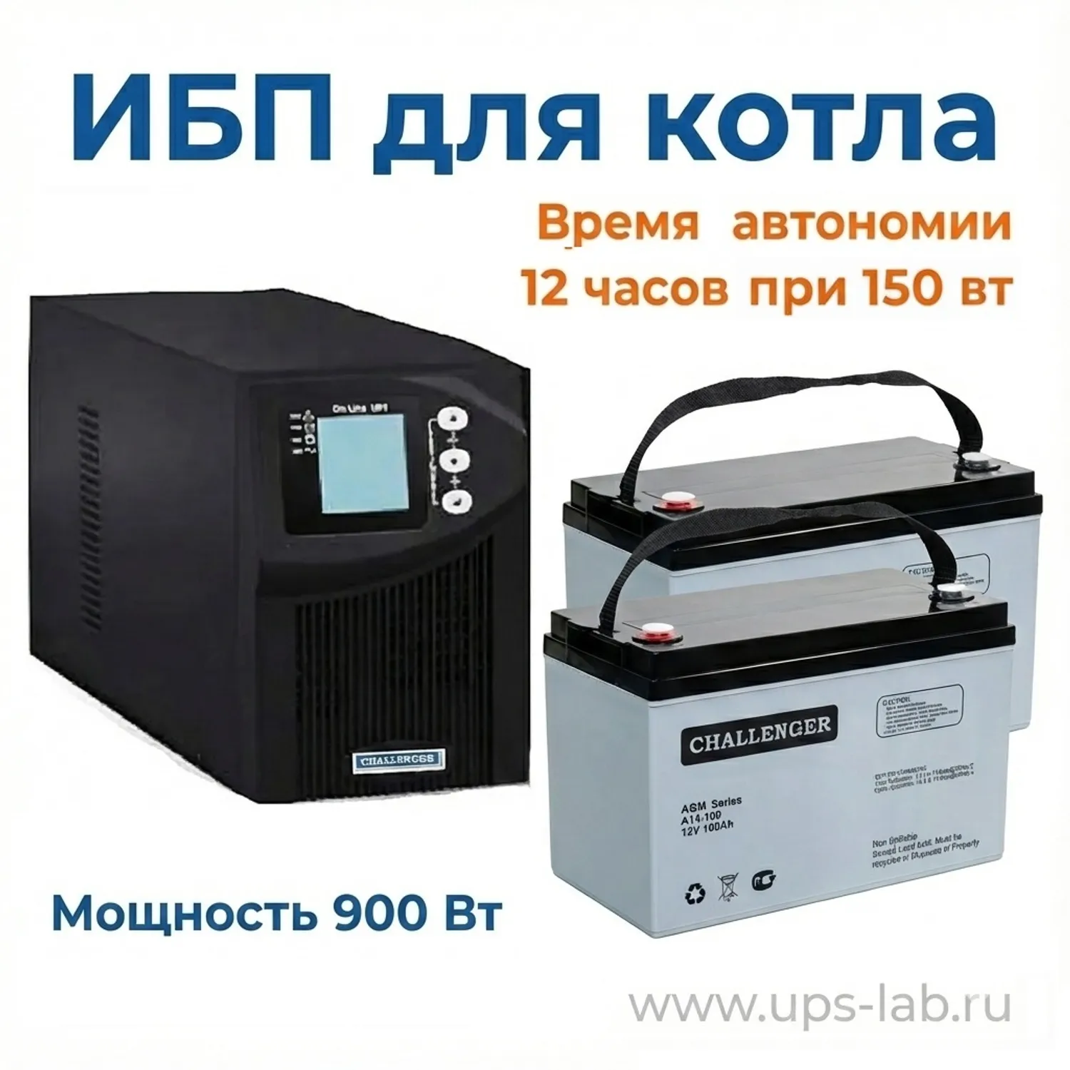 Комплект ИБП мощностью 900 Вт с аккумуляторными батареями для защиты системы отопления, автоматики котла, горелки, циркуляционного насоса, САОГ с временем автономной работы 12 часов при нагрузке 150 Вт.