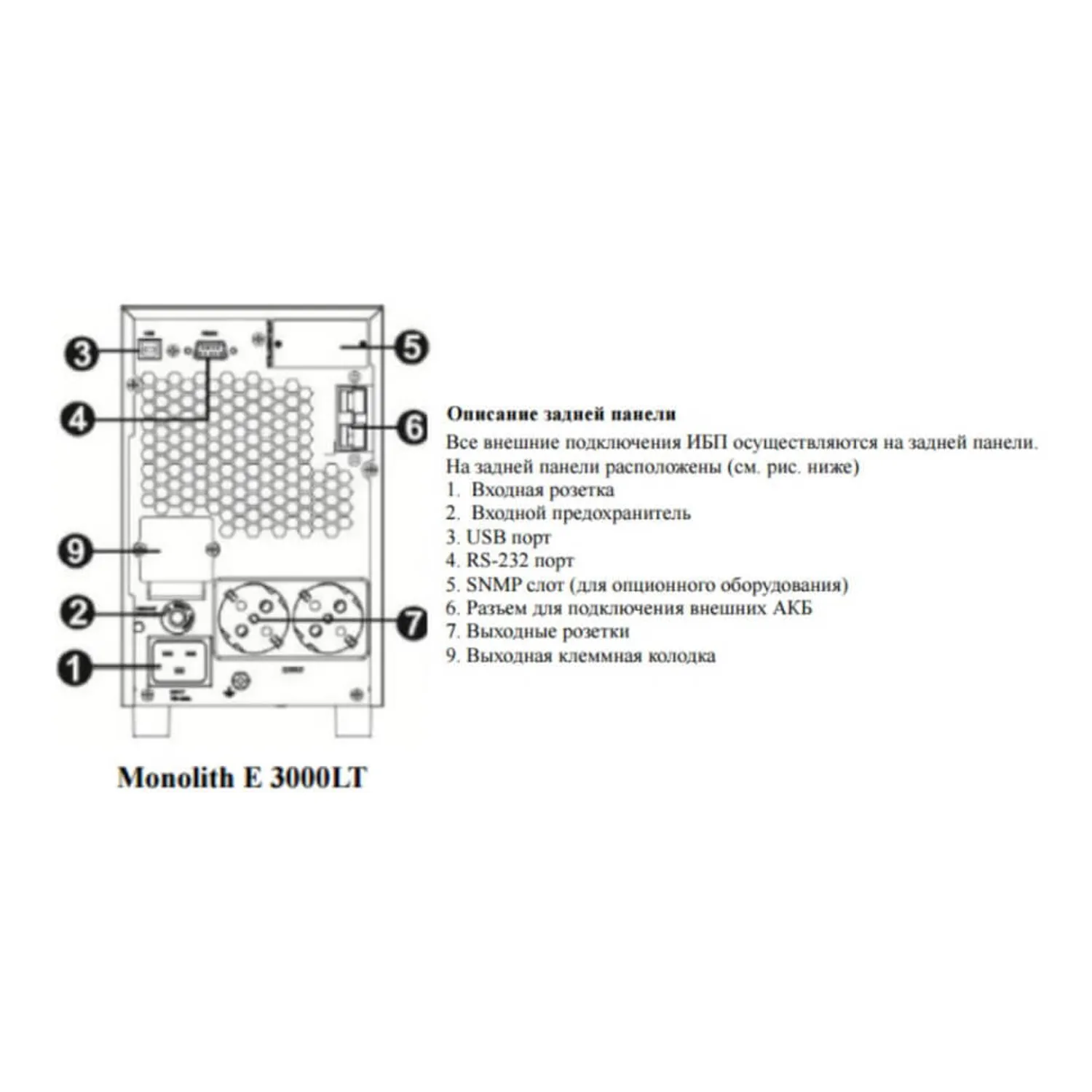ИБП ELTENA Monolith E3000LT обладает расширенными коммуникационными возможностями: имеются порты USB и RS-232, а также слот для SNMP-карты DA-806 или платы «сухих» контактов, который может работать одновременно с любым из портов.
