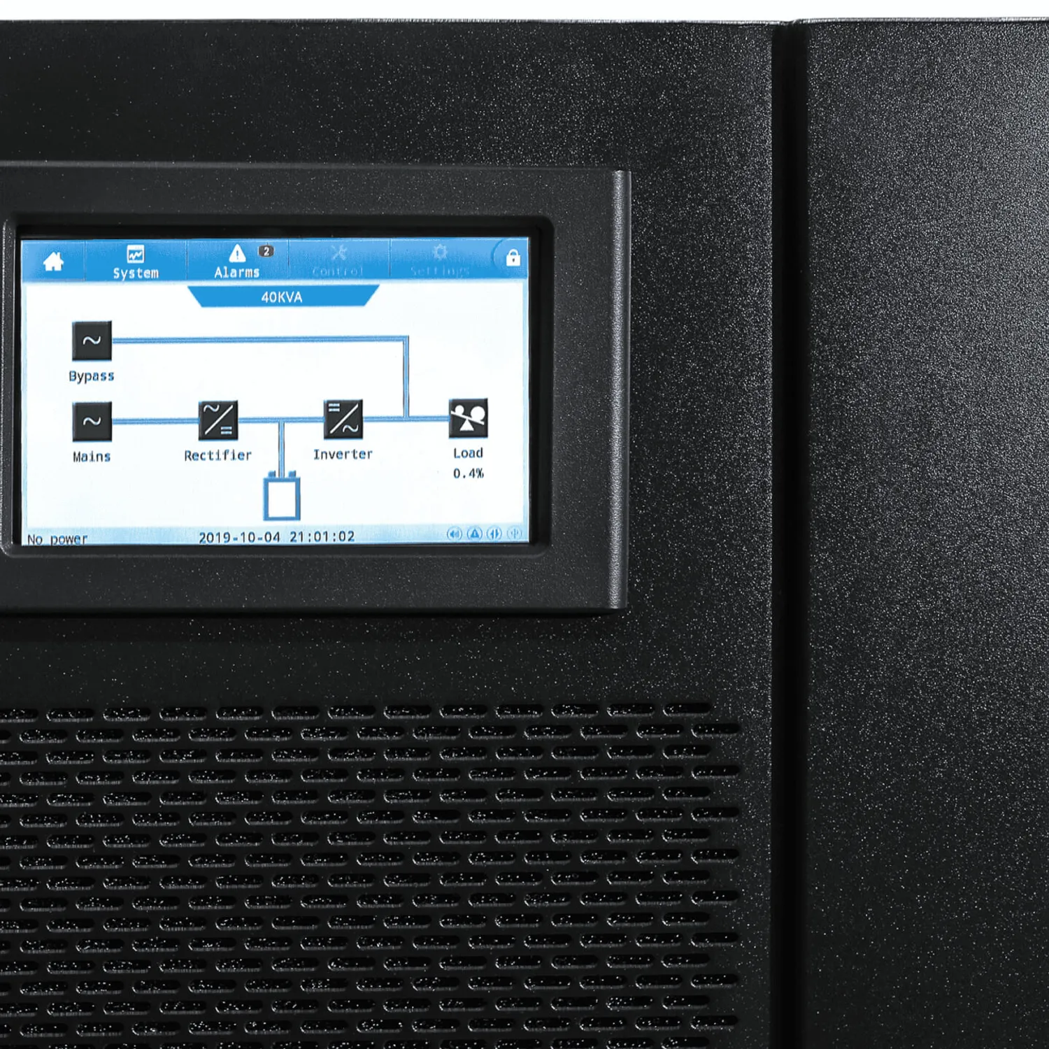 Мнемосхема работы ИБП. Показывает работу инвертора, байпаса, батарей, нагрузку, режим работы от батарей, частоту.