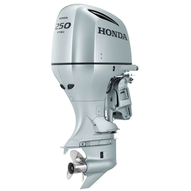 Лодочный 4-х тактный мотор HONDA BF 250 XU с дистанционным управлением, с электро запуском и инжектором - шестицилиндровый четырехтактный бензиновый мотор жидкостного охлаждения мощностью 250 л.с.. Модель Хонда BF 250 разработана на базе автомобильного двигателя Honda LEGEND (V6 с углом развала 60°), с применением конструктивных особенностей и технологий, зарекомендовавших себя в производстве данной легендарной модели. Безупречная надежность двигателей Honda, в особенности автомобильных, не нуждается в обосновании: сотни тысяч километров без ремонта - таков ресурс двигателей от японской компании. Двигатель V6, устанавливающийся на автомобили Honda бизнес-класса, максимально сбалансирован, тихий и характеризуется низкими вибрациями.