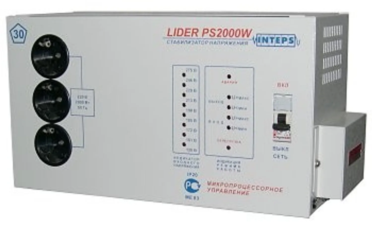 Стабилизатор напряжения Lider PS2000W-50-K предназначен для защиты бытовых приборов (кондиционеры, электрочайники, фены, пылесосы, обогреватели, свч-печи, насосы, инструменты, электромоторы). Мощность конечного потребителя (или группы потребителей) не должна превышать 2000 Ватт.